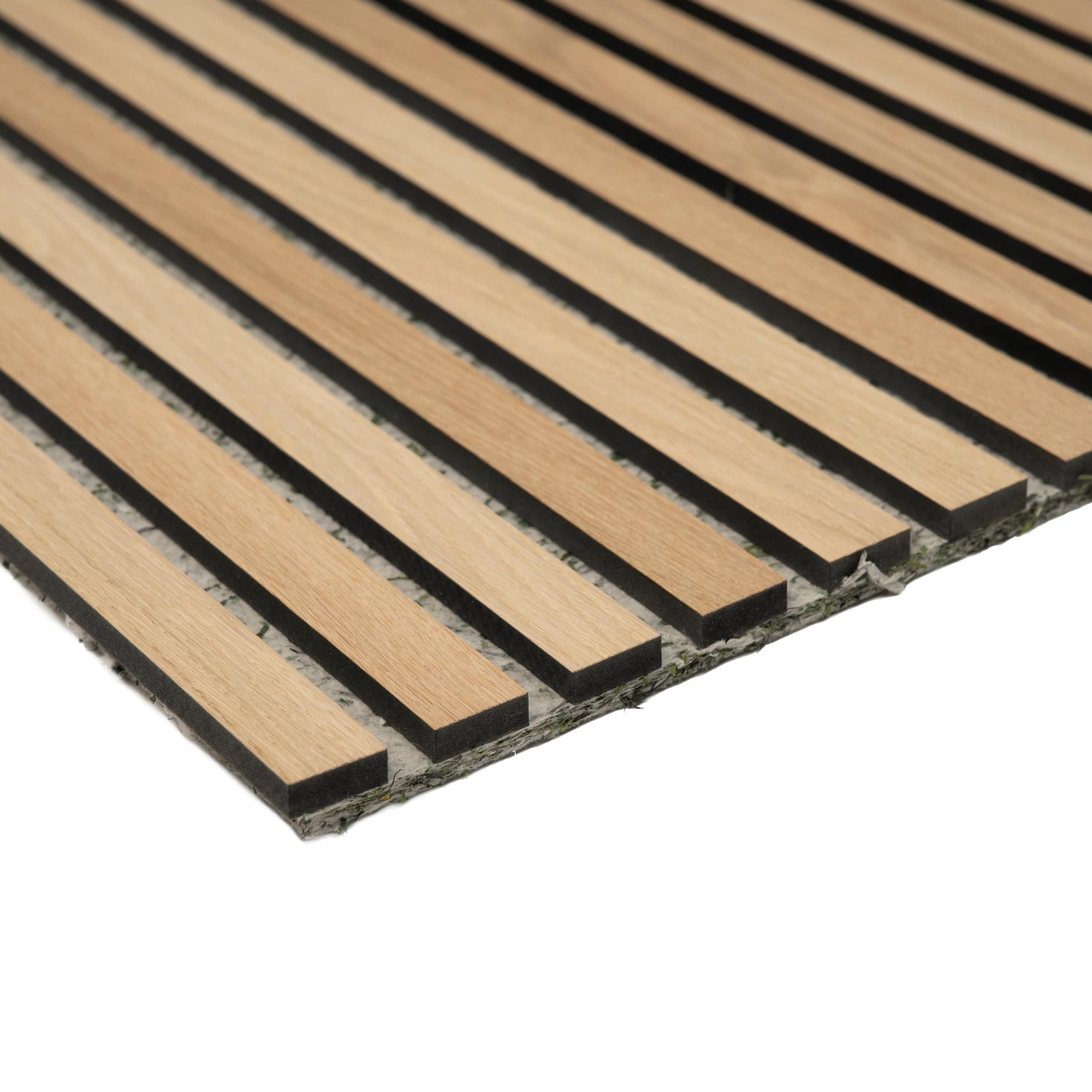 HM-wood-shop's acoustic panels are produced with 9 mm felt. On top of the 9 mm sound-absorbing felt layer, veneered MDF slats are mounted. Each slat consists of real wood veneer glued to a core of black MDF.