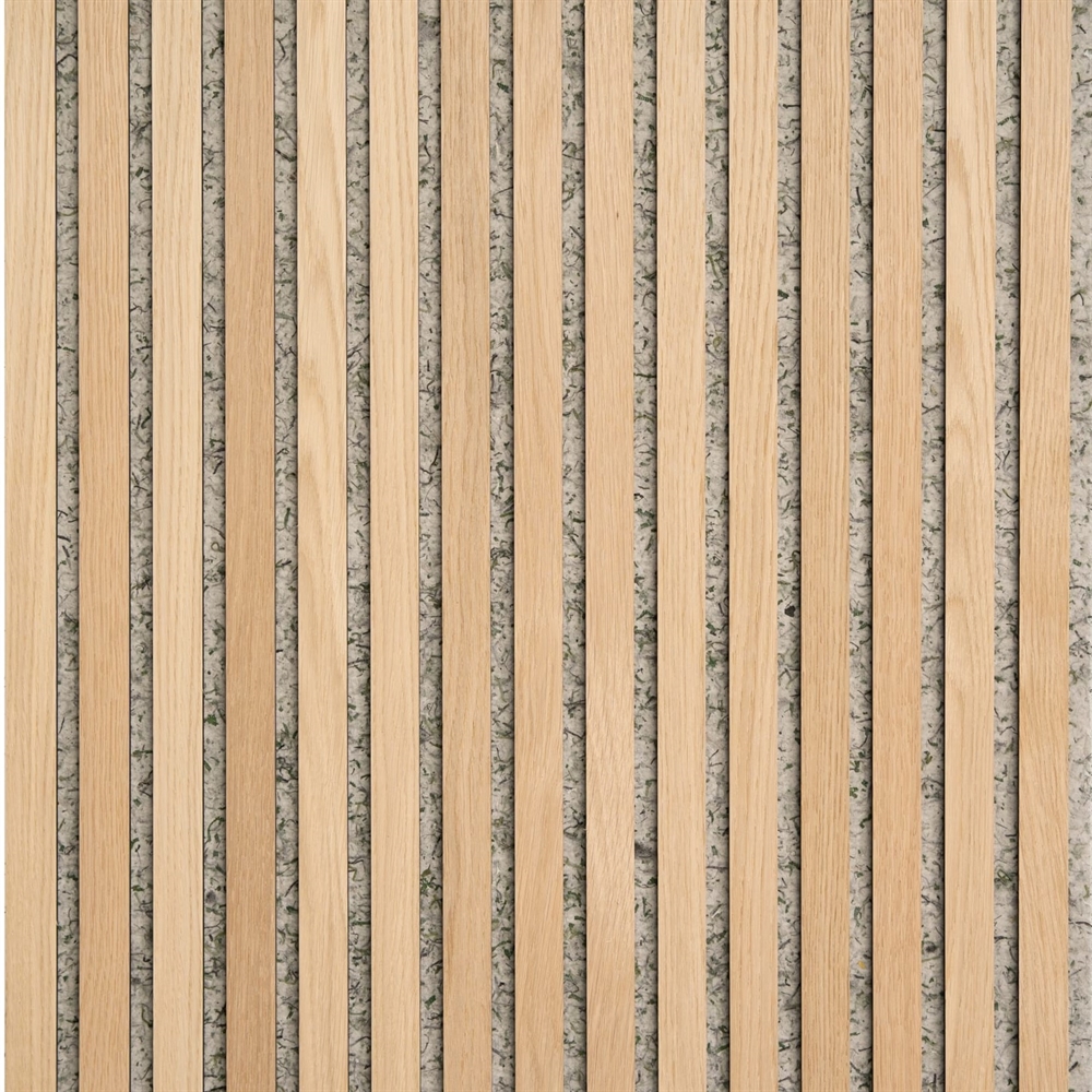 The Green Option is a more environmentally conscious wall acoustic panel, where the felt consists of 65% recycled artificial turf from training facilities used by nearly all professional football clubs worldwide. This also gives it a unique and distinctive design expression. On top of this, our slats are made of MDF, mounted with genuine wood veneer on the front. This means there may be slight variations in the appearance of the veneer.