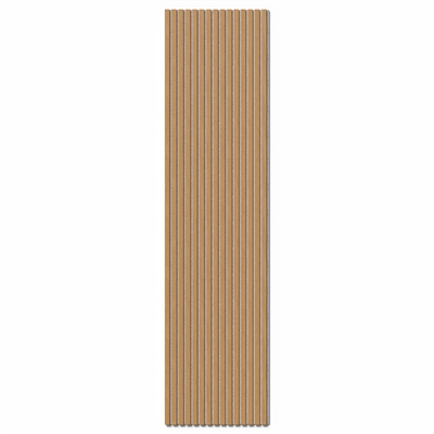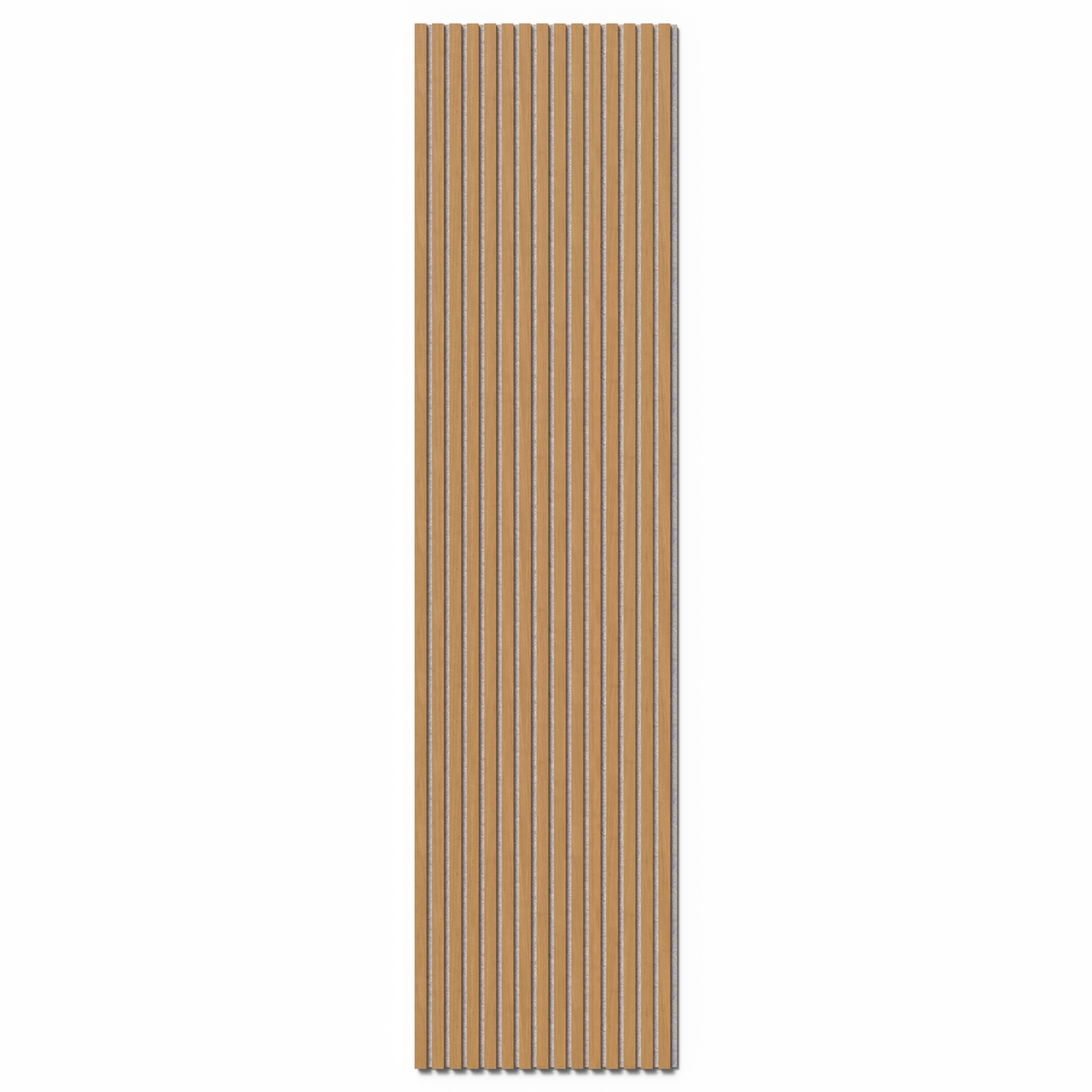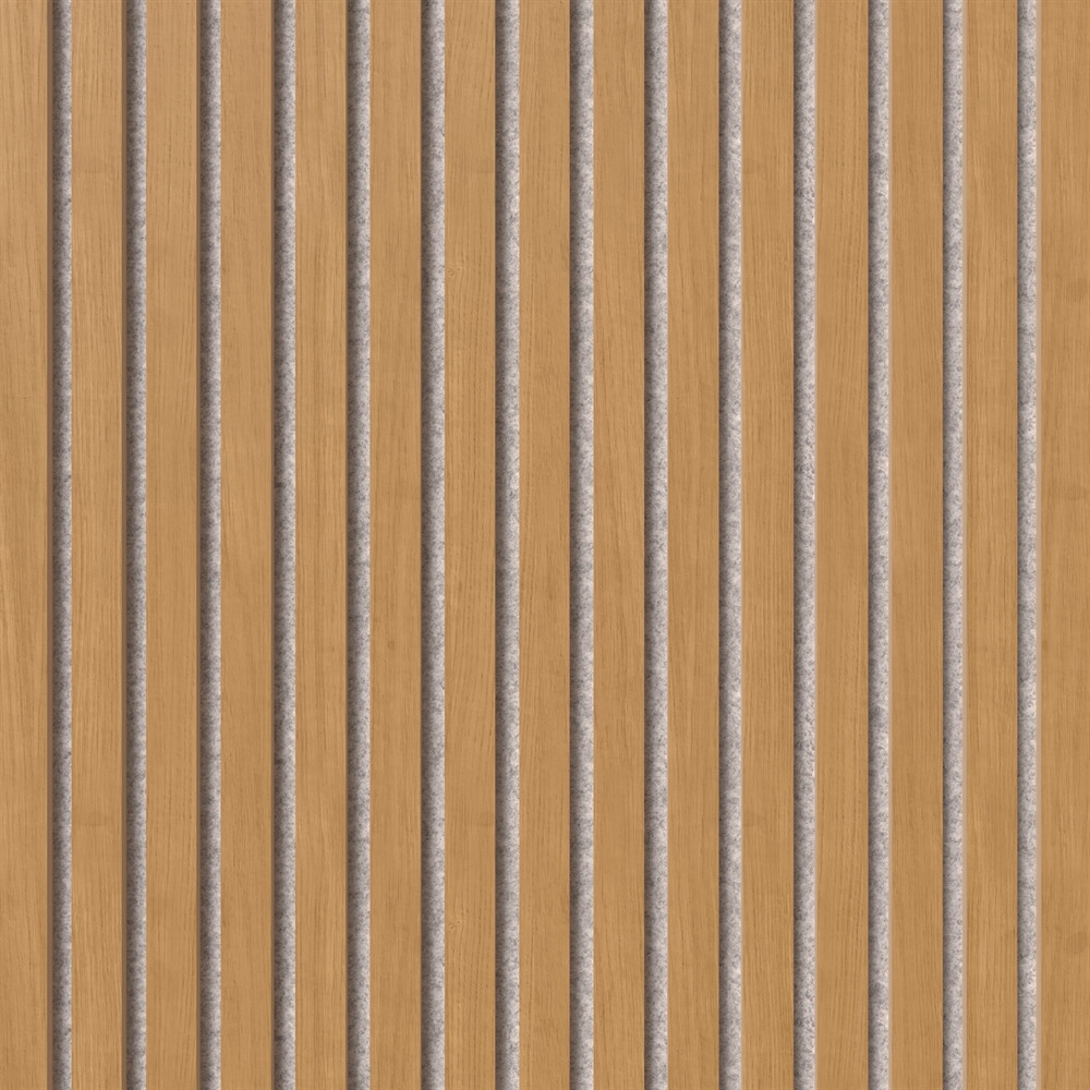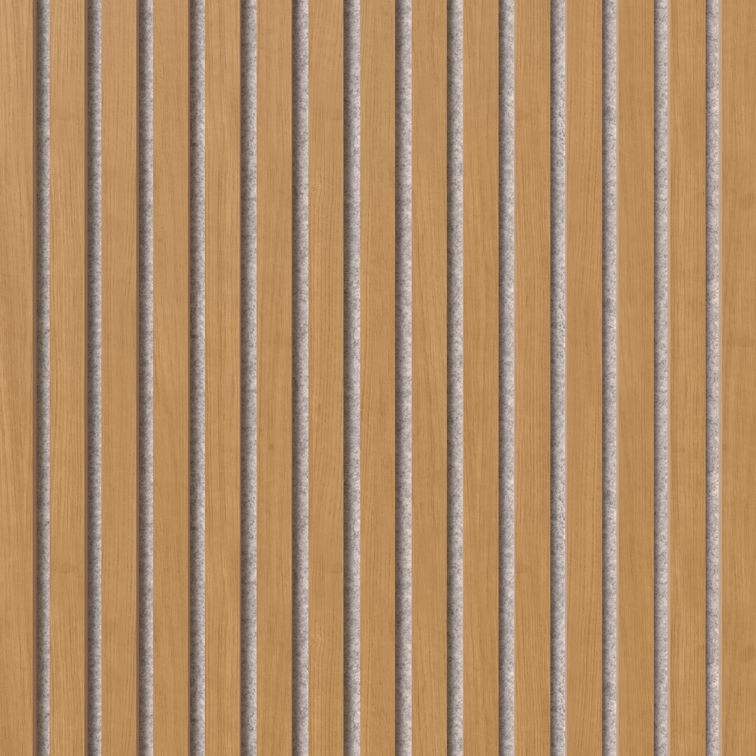 Acoustic panels are made of 9 mm polyester absorbent material made of, amongst other things, recycled plastic bottles. MDF slats are attached on top of the 9 mm sound-absorbing felt cloth. The slats are approx. 1.1 cm deep and 2.7 cm wide with a distance of 1.3 cm between each slat.